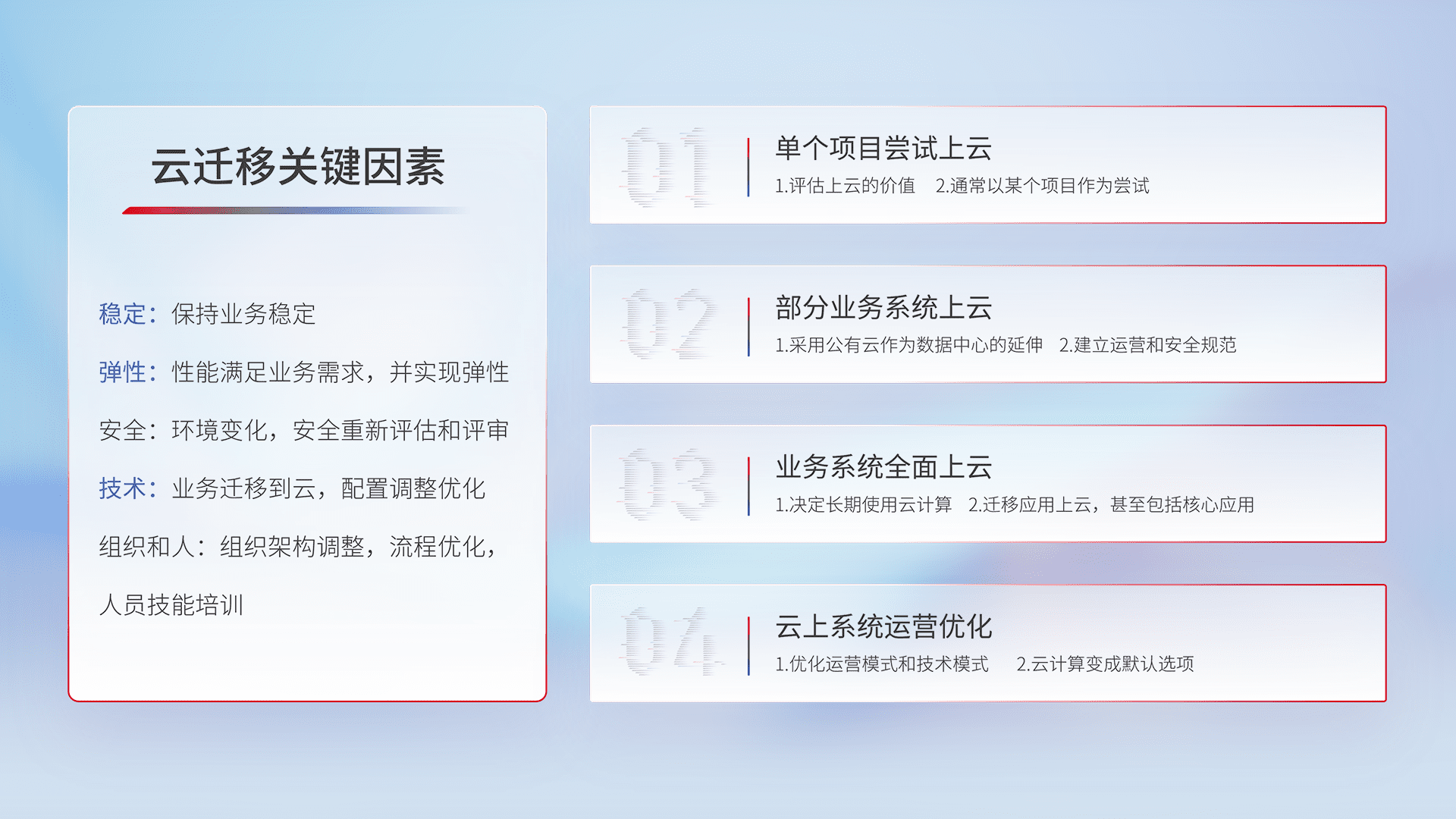 结合实际业务,,,,从规划设计、、云平台选型、、、云原生改造、、、、数据迁移、、集成交付,,迁移全过程为客户识别最佳上云路径,,,,做好风险识别管理,,,,设计网络架构、、、身份权限、、、安全审计合规、、、操作审计、、日志审计、、、、监控告警策略、、、、多站点容灾设计等,,对云上基础设施进行整体规划,,,,提升IT治理水平,,以满足弹性、、高可用、、、高性能的需求。。。。