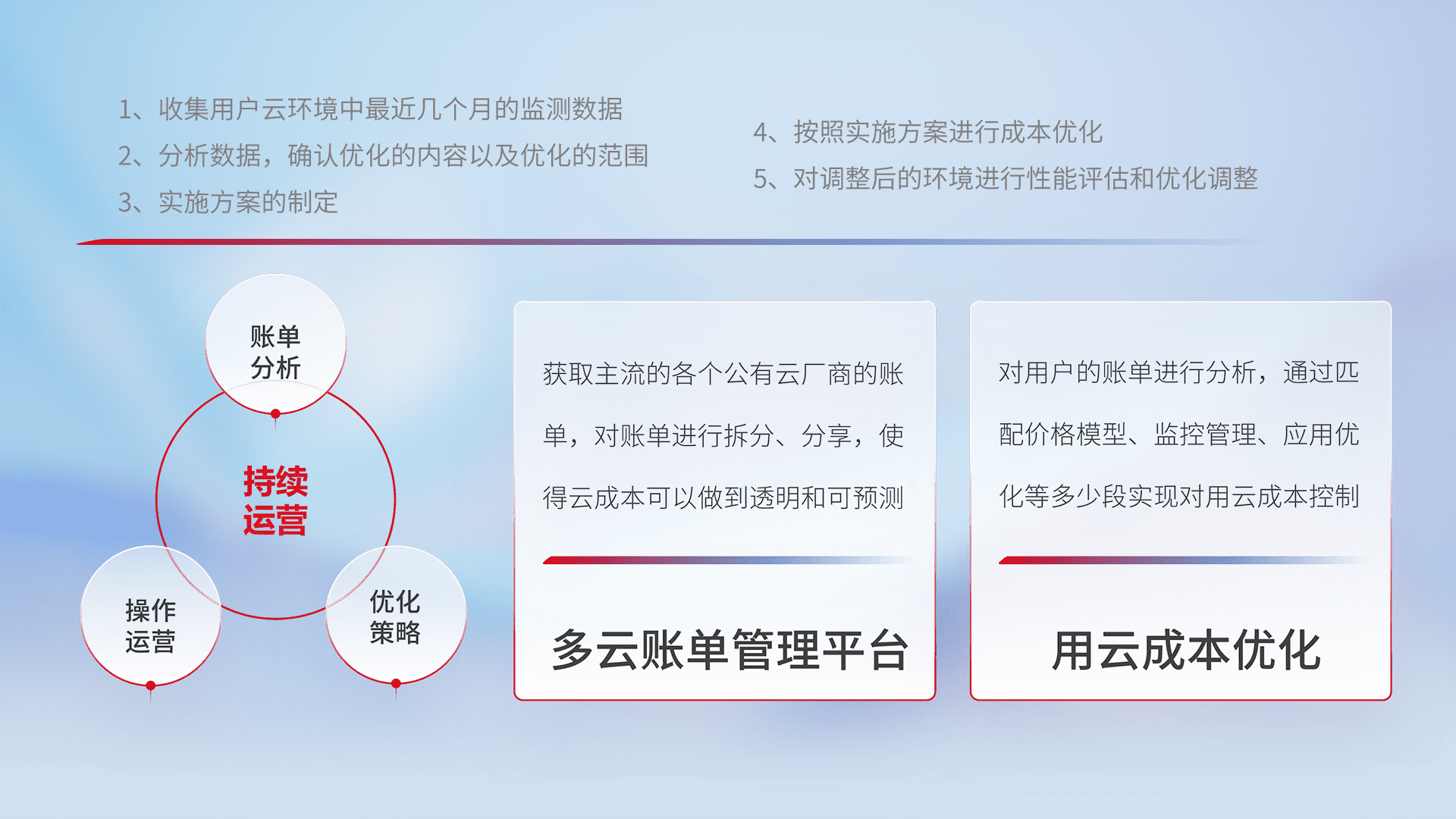 通过多云纳管,,,,以统一的资源数据模型把客户的云资源进行抽象和封装,,进而实现对多云资源的统一操作,,保障云资源管理的可靠性、、稳定性与可用性。。量身定制化运维内容,,,配置、、开发运维、、、补丁管理、、、备份、、、监控、、认证和访问管理、、、审计和日常巡检等,,,保障在用云过程中的可靠度,,,,稳定度以及高可用率。。。
